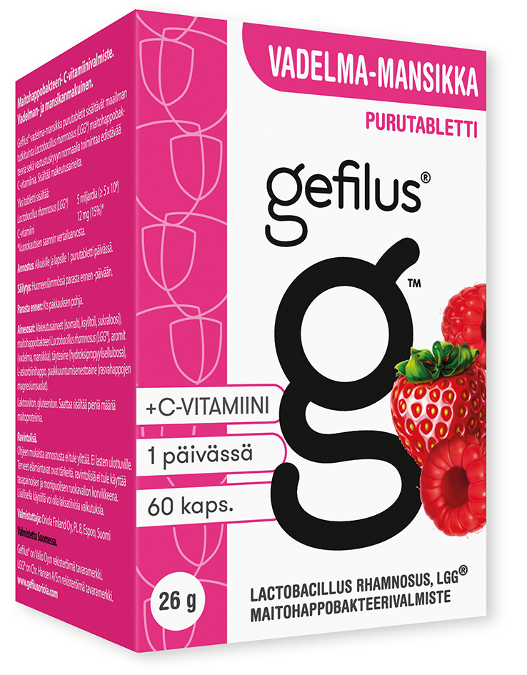 Mustikka-mansikan makuinen Gefilus® -purutabletti sisältää maailman tutkituinta LGG-maitohappobakteeria sekä sinkkiä ja C-vitamiinia. Laktoositon ja gluteeniton. Saattaa sisältää pieniä määriä maitoproteiinia.